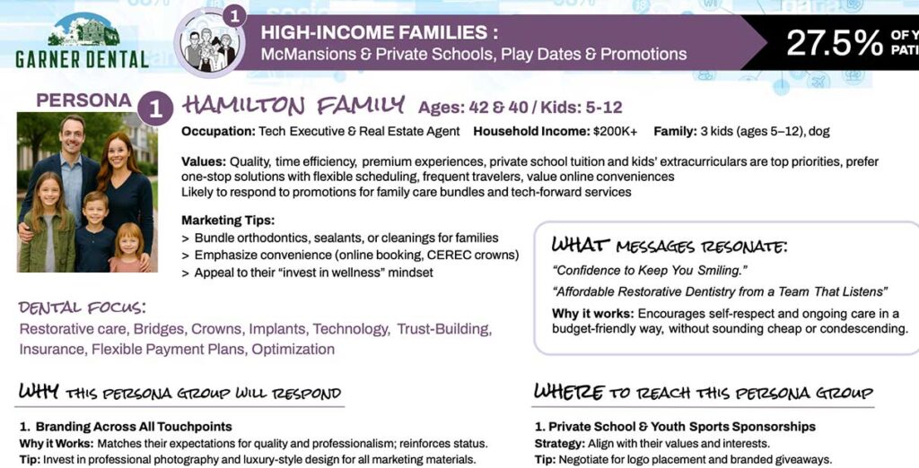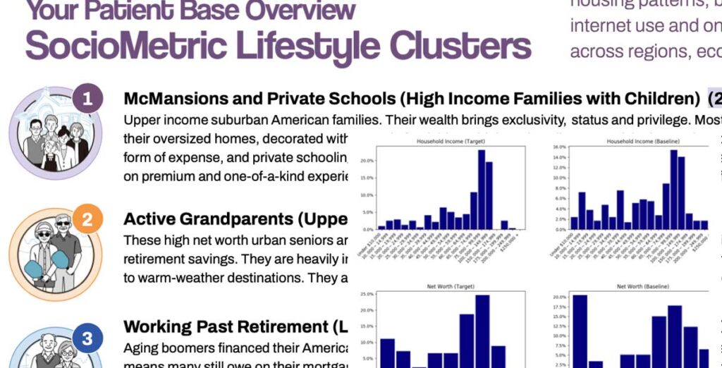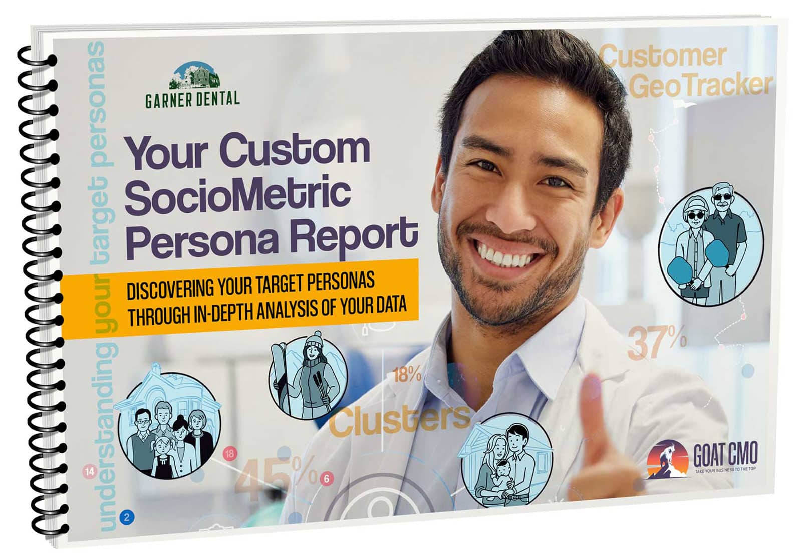 Our proprietary, data-driven SocioMetric Persona Report takes knowing your customer base to the next level. Using your patient data we provide a robust report detailing where your customers are, how they spend their time and money, and what matters to them.This valuable sociometric data enables us to group your customers into lifestyle clusters. From here, we are able to identify your top patient personas, along with key details on what specific dental messaging, types of offers, and marketing channels will resonate most with them.